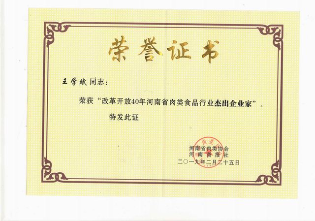 榮譽‖洛陽正大獲評改革開放40年河南肉類食品行業(yè)強勢企業(yè)、王學(xué)斌***總裁榮獲改革開放40年河南肉類食品行業(yè)杰出企業(yè)家