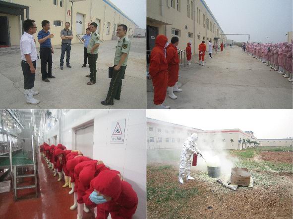 吉林德惠寶源豐禽業(yè)發(fā)生特大事故,造成120人遇難,在全國安全月伊始之時發(fā)生如此重大事故,教訓慘痛。為吸取這一慘痛的經(jīng)驗教訓,落實于董事長關于安全整頓的要求,進一步增強員工安全意識和自我救助能力,公司于2013年6月7日在各分廠車間、制冷機房和廠區(qū)空地三處演習地點舉行了緊急疏散、液氨泄漏緊急處置和消防滅火的實戰(zhàn)演練。