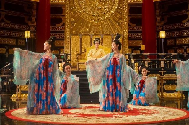 中秋夜游天堂名堂,大殿載歌載舞,仿佛回到千年前大唐盛世。中秋之日,一群盛裝歌姬白天登闕樓一睹恢弘盛世,傍晚在河邊放逐水燈許愿、思念家鄉(xiāng),夜晚在華麗的舞臺(tái)歌舞升平。一派大國盛世、國泰民安的場(chǎng)景。